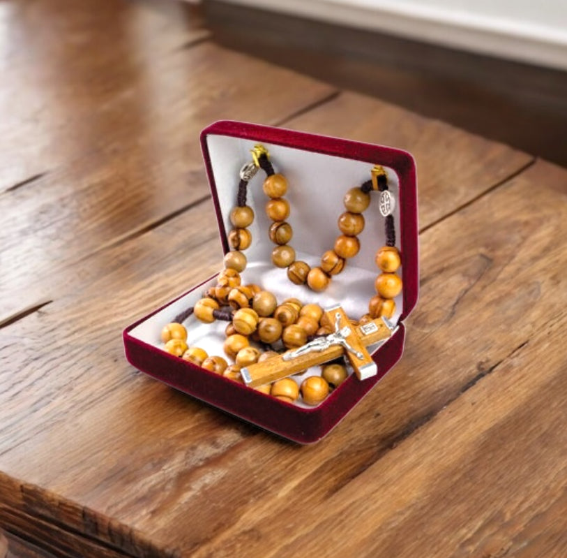 Este santo rosario está confeccionado con cuentas de auténtica madera de olivo de la Tierra Santa de Jerusalén. Con una medida de 22.5 pulgadas de largo, es perfecto para llevarlo como sacramental en el cuello o guardarlo en el bolsillo como instrumento de oración y meditación.