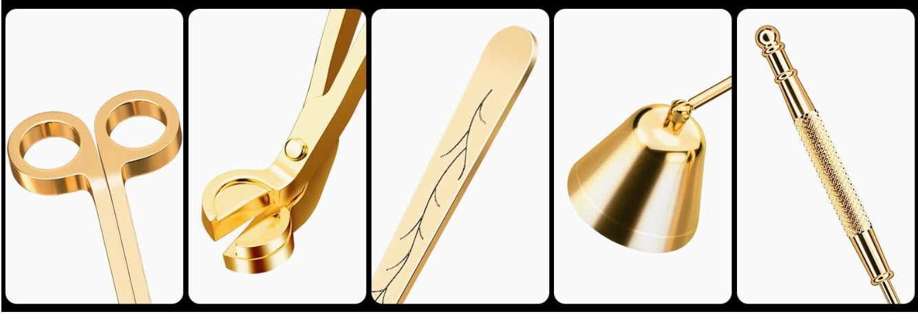 3-in-1 Candle Accessory Set: Includes a wick trimmer, candle snuffer, and wick dipper, all in an elegant gold finish. This complete candle care kit is perfect for candle lovers, helping to keep candles in excellent condition, extend their burn time, and ensure a clean and safe burn. Ideal as a gift or as a stylish addition to any space.